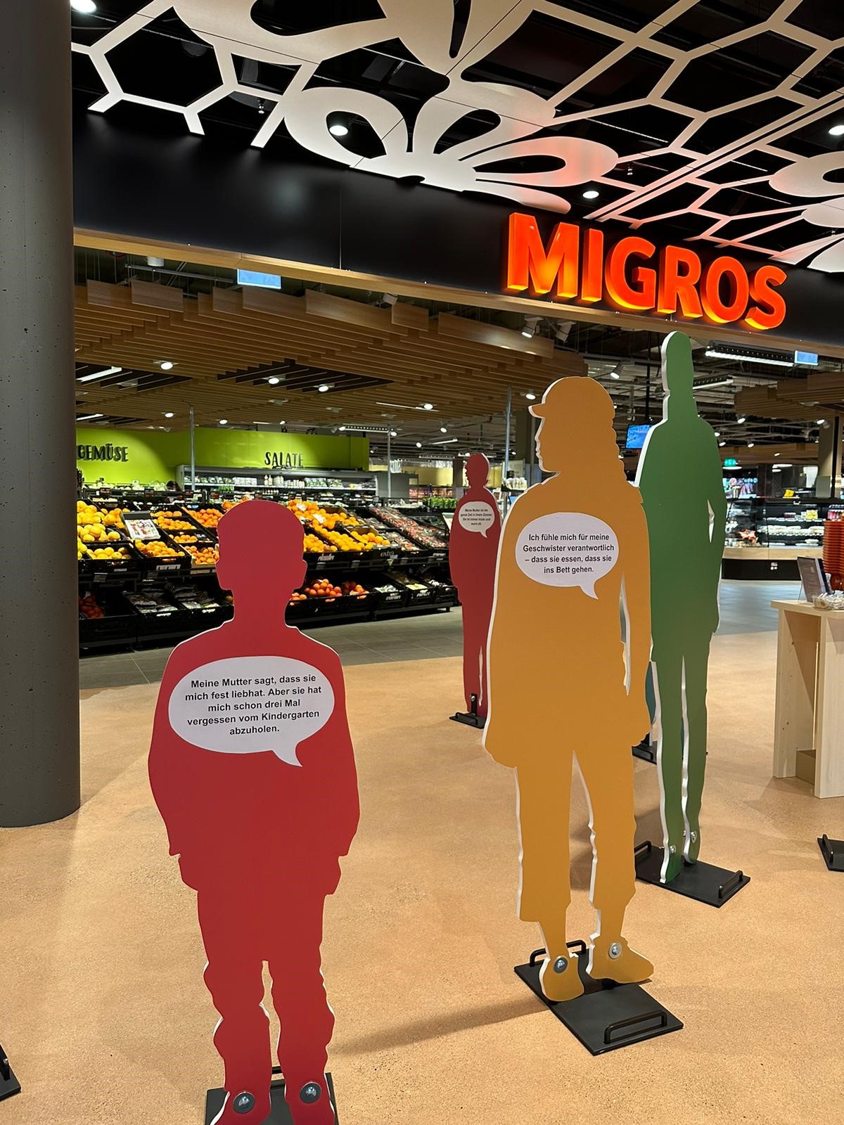 Jeudi 14Im Eingangsbereich der Migros Herisau werden Kinderfiguren mit Sprechblasen aufgestellt. Von 08:00 Uhr bis 12:00 Uhr ist das Team der Beratungsstelle für Suchtfragen vor Ort, um mit der Bevölkerung ins Gespräch zu kommen. Ziel ist es, die Bevölkerung zu sensibilisieren und auf das Unterstützungsangebot der Beratungsstelle aufmerksam zu machen.